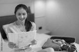 Smiling Asian woman enjoying travel planning with paper map inside a cozy hotel room preparing for her exciting vacation adventure