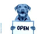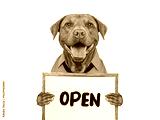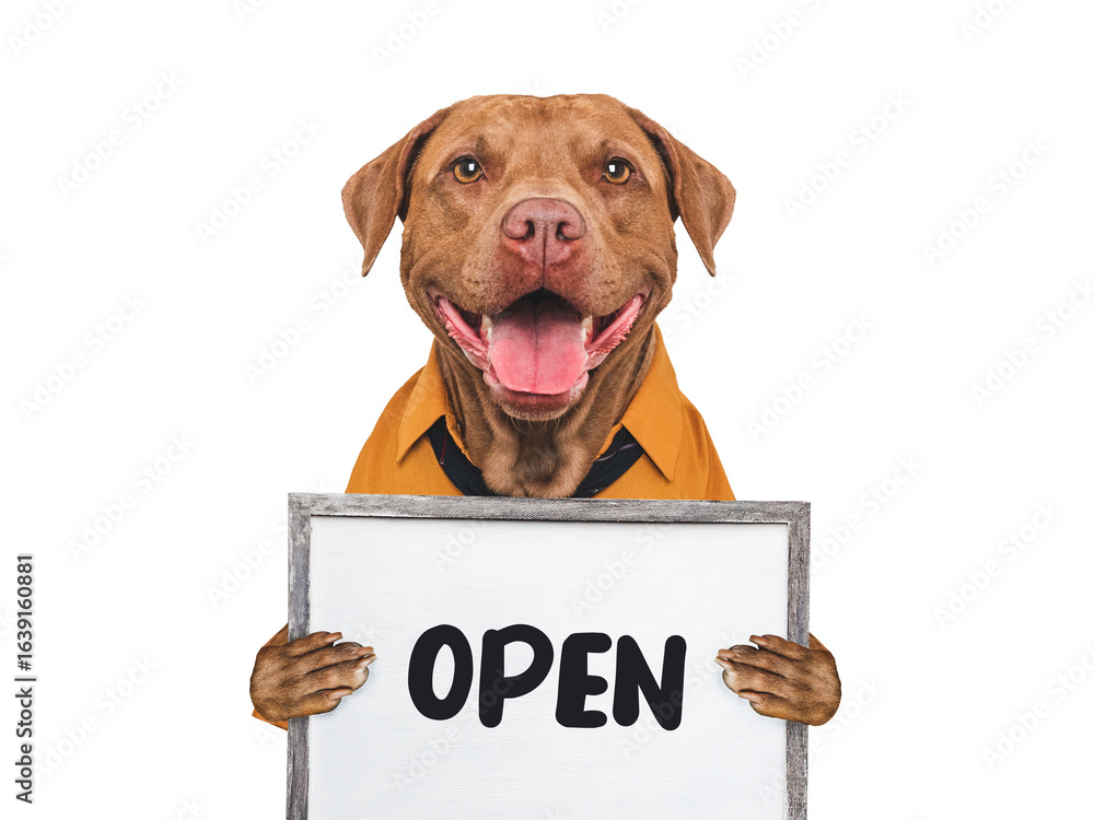 Cute dog and signboard with inscription OPEN. Closeup, isolated background. Studio shot, day light. Concept of care, education, obedience training and raising of pet