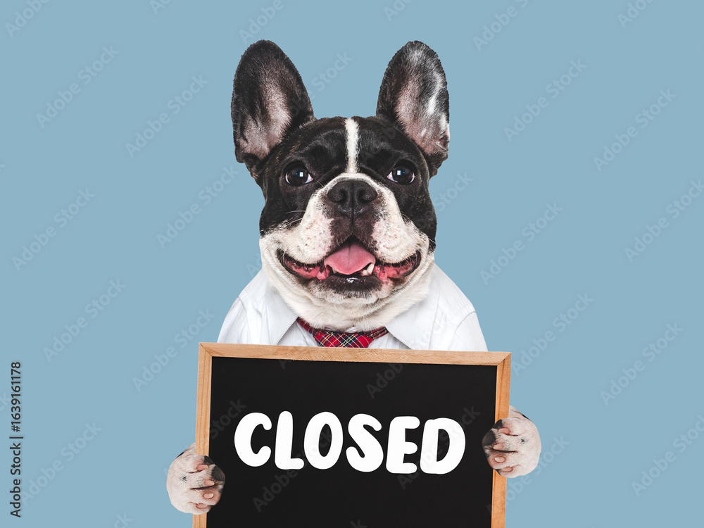 Cute puppy and signboard with inscription CLOSED. Closeup, isolated background. Studio shot, day light. Concept of care, education, obedience training and raising of pet