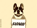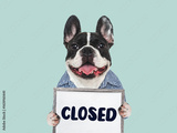 Cute puppy and signboard with inscription CLOSED. Closeup, isolated background. Studio shot, day light. Concept of care, education, obedience training and raising of pet