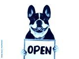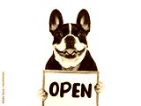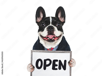 Cute puppy and signboard with inscription OPEN. Closeup, isolated background. Studio shot, day light. Concept of care, education, obedience training and raising of pet