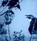 Two Tui birds fighting over flowering cherry blossoms. Auckland. New Zealand.