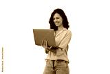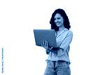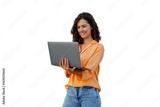 Young woman with curly hair and orange shirt holding a laptop and smiling on a transparent background