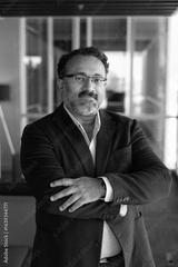 Confident senior Indian CEO man in glasses and formal jacket posing for vertical business portrait with hands folded, looking at camera. Mature businessman, company executive headshot