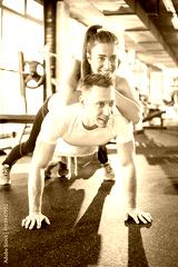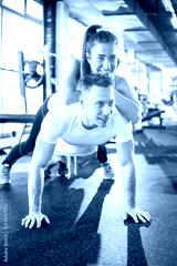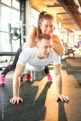 Young sporty couple exercising together in gym. Man doing push ups while girl lying on him.