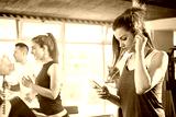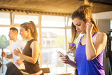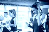 Young woman listening to music on smart phone while running on treadmill in gym.