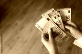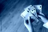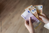 Female hands holding and counting money euro banknotes, with visible 500 euro and many 50 euro on blurred background with copy space. Various euro currency bills in women's hands