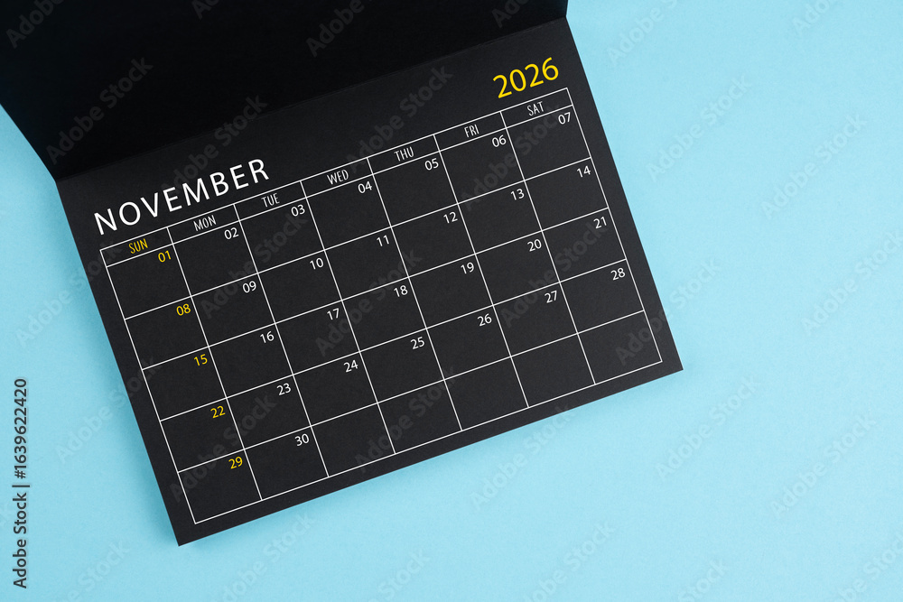 November 2026 Black calendar opening on blue color background.