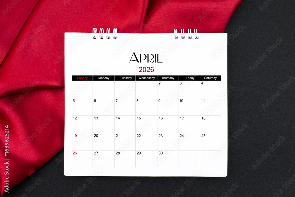 April 2026 Monthly desk calendar with red silk on black color leather background.