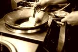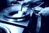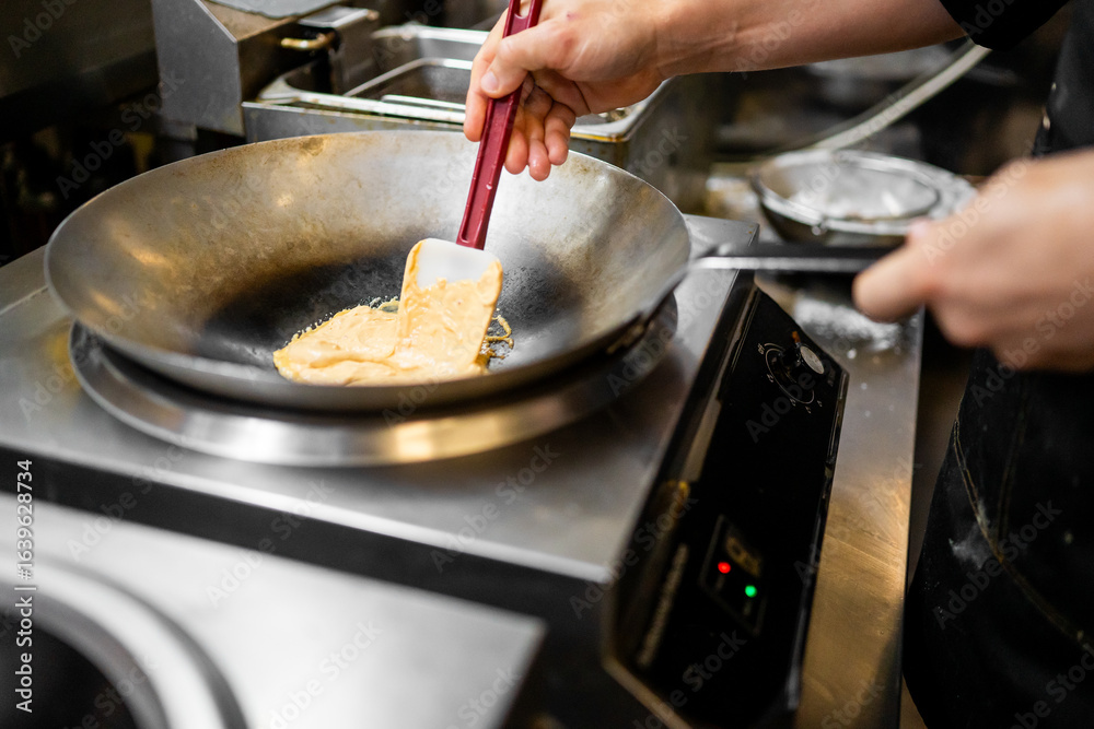 Professional chef stirring creamy mixture in wok on induction cooktop, showcasing culinary skill and precision in a modern kitchen
