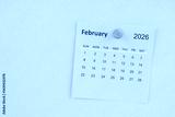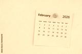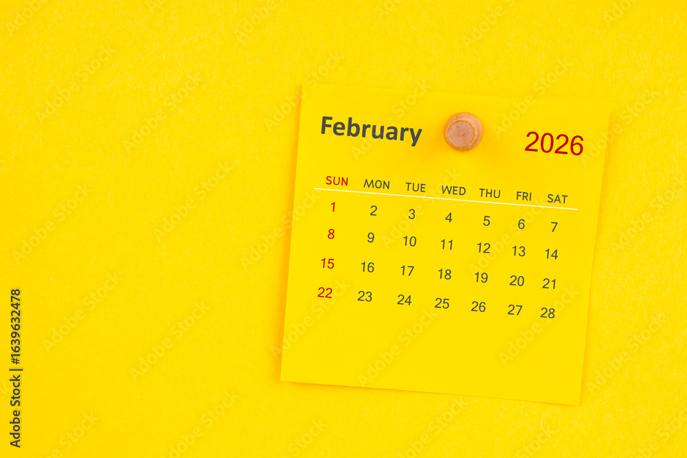 February 2026 calendar sheet with thumbtack on yellow color background.