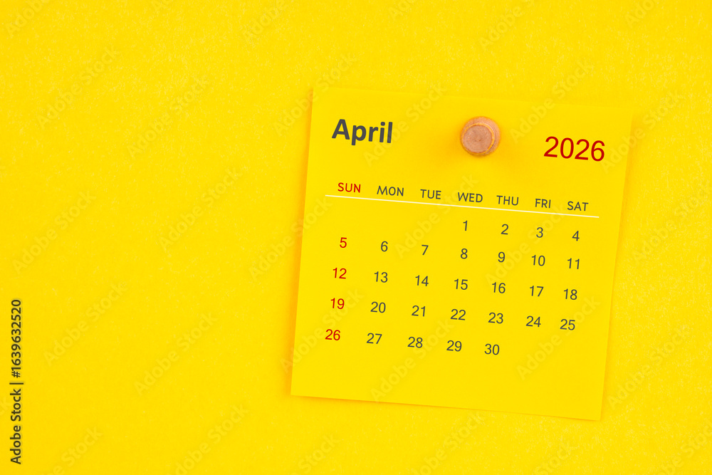 April 2026 calendar sheet with thumbtack on yellow color background.