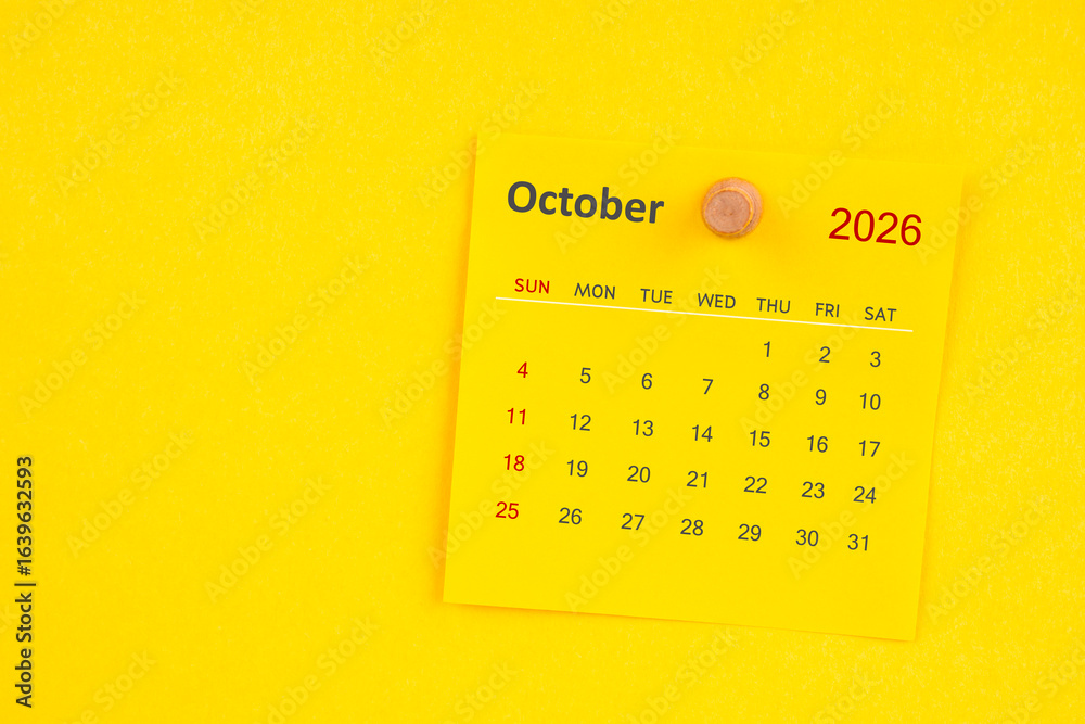 October 2026 calendar sheet with thumbtack on yellow color background.