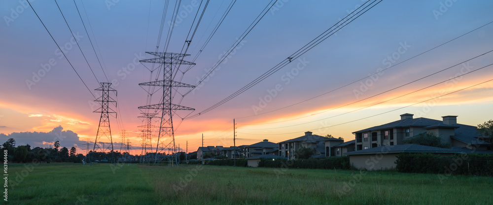 Group silhouette of transmission towers (power tower, electricity pylon, steel lattice tower) at twilight in US. Texture high voltage pillar, overhead power line, industrial background. Panorama style