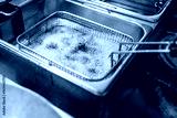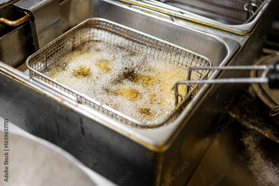 Metal basket with food submerged in hot oil inside a deep fryer, bubbling as it cooks. Commercial kitchen scene showing deep frying process