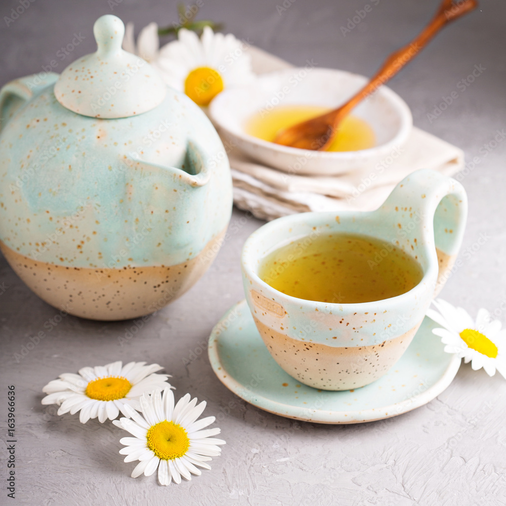 Camomille tea in handmade ceramic cup