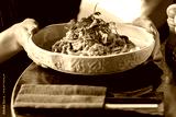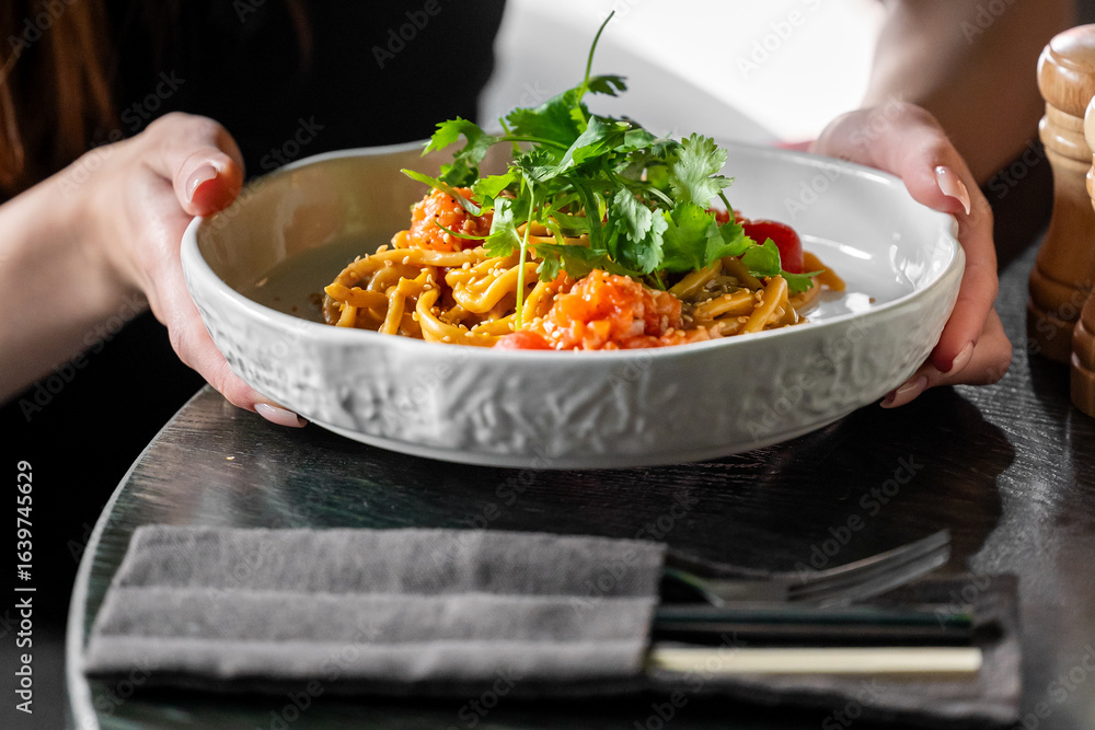 Close-up of hands holding a bowl of pasta with fresh cilantro and diced tomatoes on a dark wooden table with napkin and cutlery.