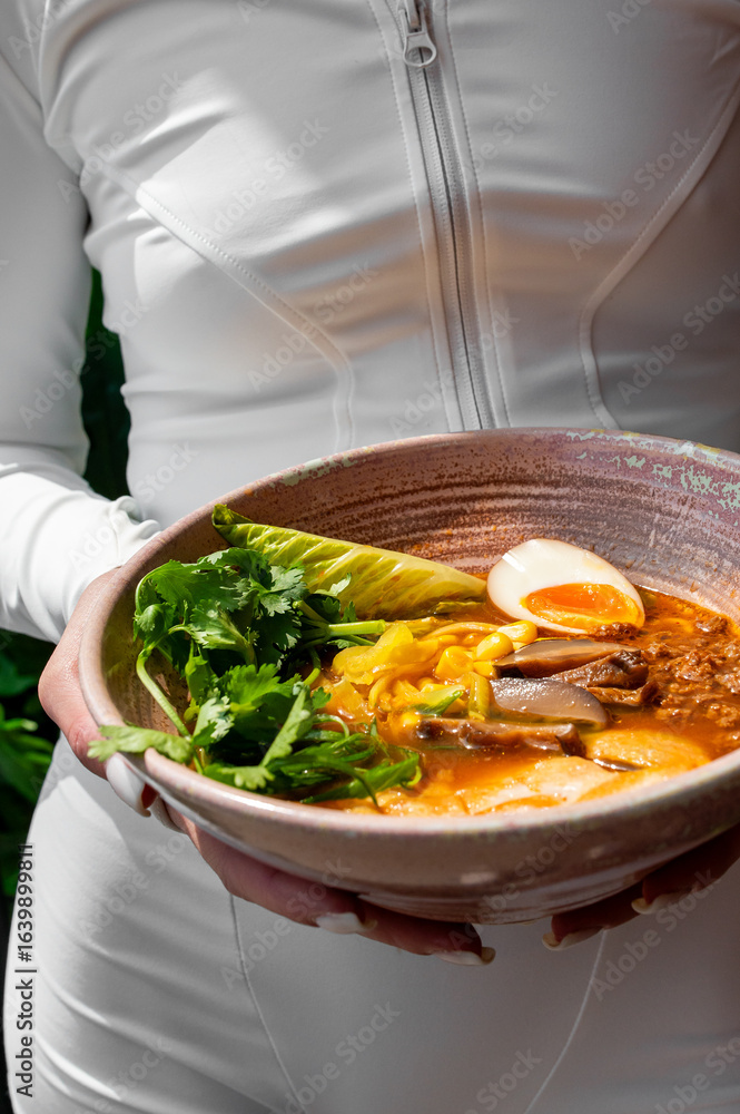 Close-up of a person in white holding a bowl of ramen with mushrooms, cabbage, cilantro, and a soft-boiled egg. Fresh, flavorful Asian cuisine served with care