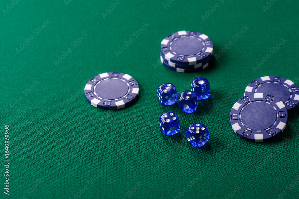 Dice poker game with chips, bets and risk in casino. Dice poker