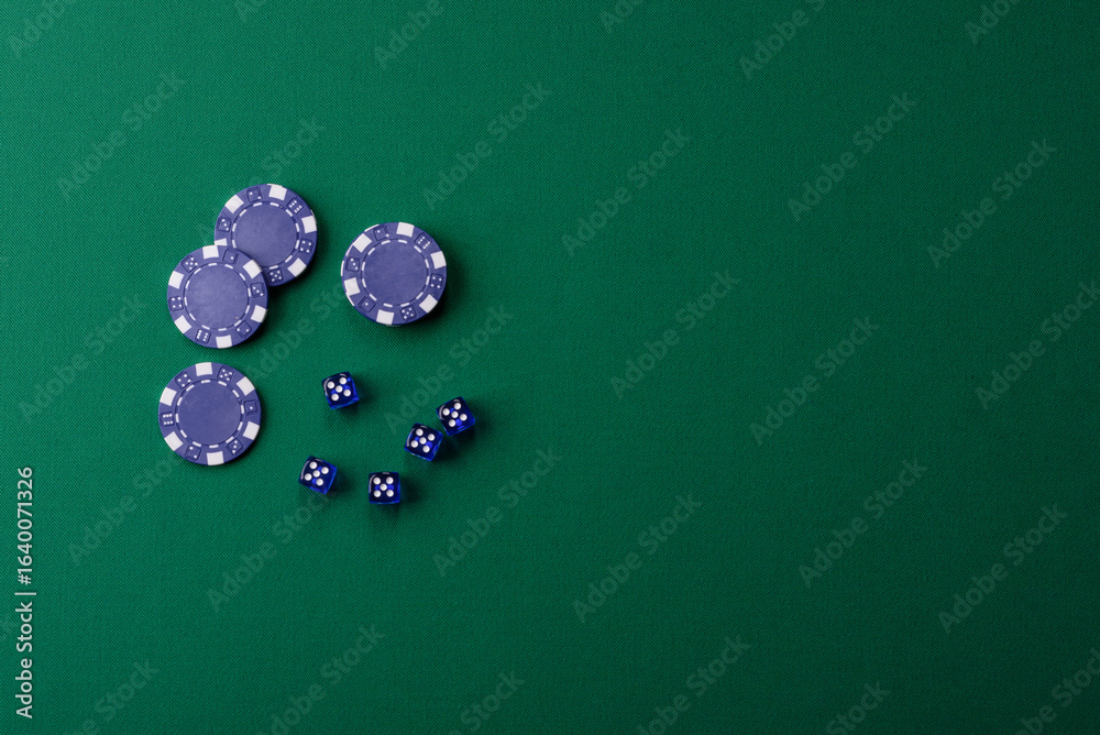 Dice poker game with chips, bets and risk in casino. Dice poker