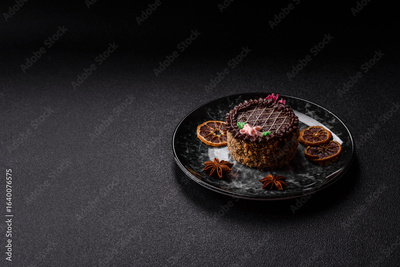 Sweet tart, pie with chocolate and cream with fruit filling on a plate. Chocolate tart