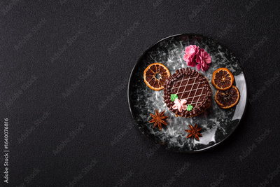 Sweet tart, pie with chocolate and cream with fruit filling on a plate. Chocolate tart