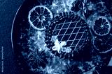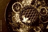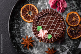 Sweet tart, pie with chocolate and cream with fruit filling on a plate. Chocolate tart