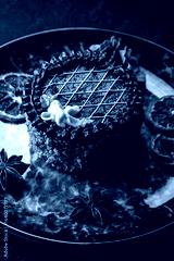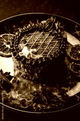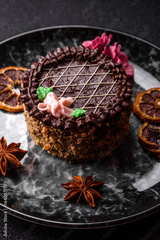 Sweet tart, pie with chocolate and cream with fruit filling on a plate. Chocolate tart