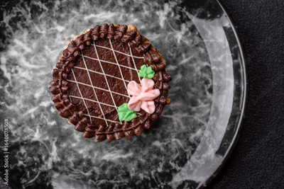 Sweet tart, pie with chocolate and cream with fruit filling on a plate. Chocolate tart