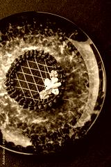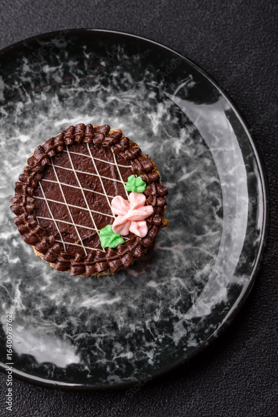 Sweet tart, pie with chocolate and cream with fruit filling on a plate. Chocolate tart