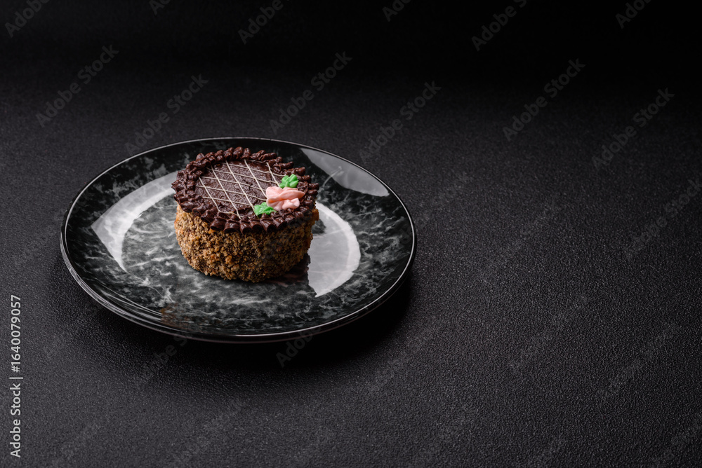 Sweet tart, pie with chocolate and cream with fruit filling on a plate. Chocolate tart