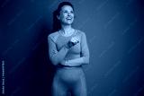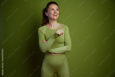 A young woman with brown hair points upwards in a matching green athletic top and leggings, conveying a positive and energetic mood against a light green background.