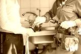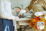 A plumber and client work together to remove an old kitchen faucet after completing pipe repair, highlighting teamwork and service interaction.