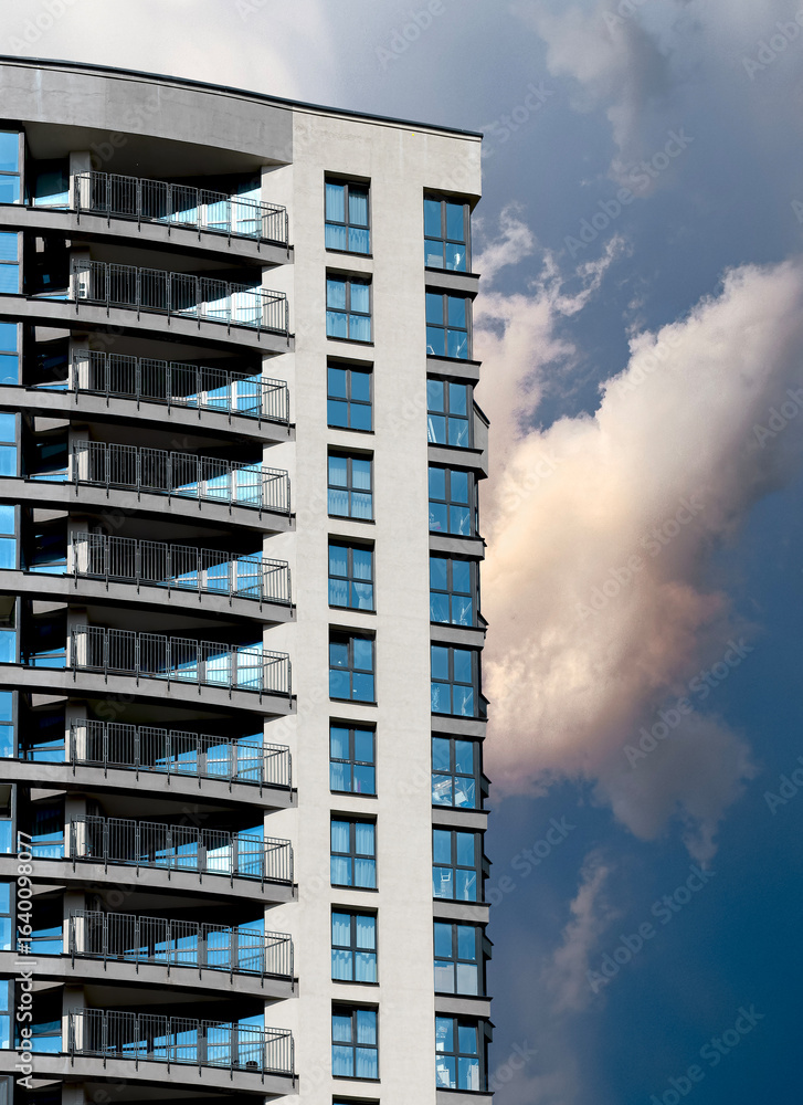 downtown tower with glass facade and balconies in modern architectural design. Tall multistorey