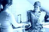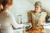 A plumber receives a credit card payment from a client in a bright kitchen. The scene suggests a successful home repair service and transaction.