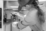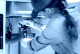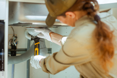 Close-up of a plumber in a tan jumpsuit tightening a white pipe fitting under a sink with a yellow and black wrench during a home repair.