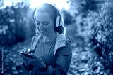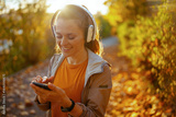 Hello autumn. smiling stylish woman in fitness clothes in the park with headphones.