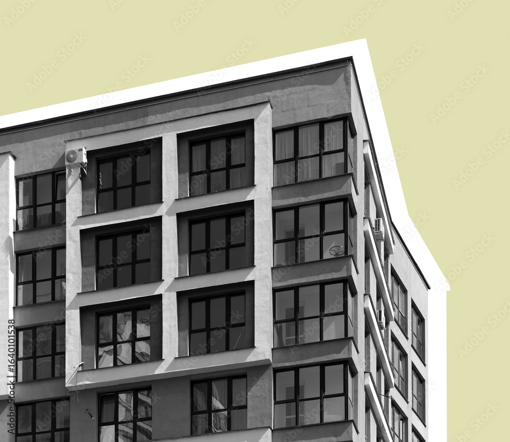Modern building in developing neighborhood. Residential and commercial highrise with balconies,