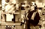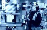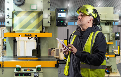 Factory worker in safety gear using digital tablet to monitor and control industrial press machine, representing manufacturing, engineering, production, technology.