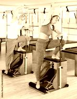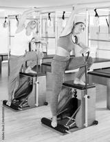 Motivated young man and woman leading healthy, active lifestyle, performing challenging Pilates exercises on Wunda chairs in modern bright studio ..
