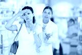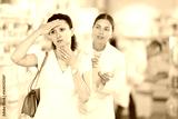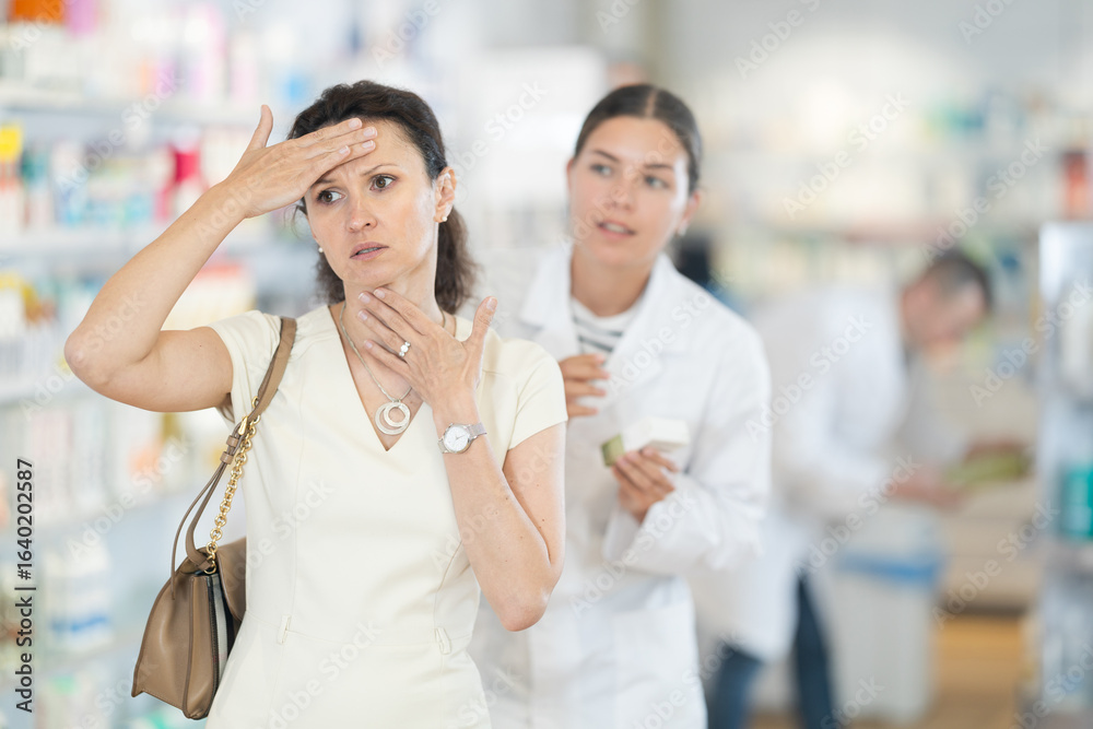 Middle-aged woman feeling pain standing with her back to female pharmacist offering remedy to her in drugstore