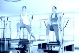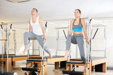 Motivated young man and woman leading healthy, active lifestyle, performing challenging Pilates exercises on Wunda chairs in modern bright studio ..