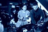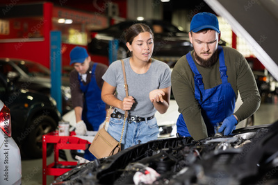 Young guy mechanic advises young woman client on repairing under hood of car in car service station