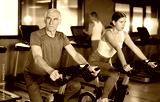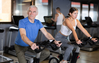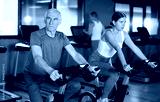 Elderly athletic man in sportswear training on exercise bike in gym