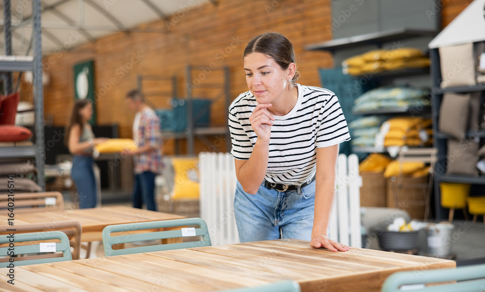 Interested young girl thoughtfully evaluating patio furniture options in garden store, choosing comfortable and functional table for friendly gatherings