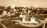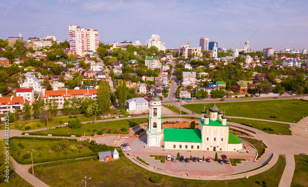View from drone of Voronezh cityscape overlooking Admiralty square and Assumption Church, Russia
