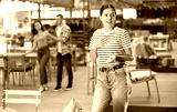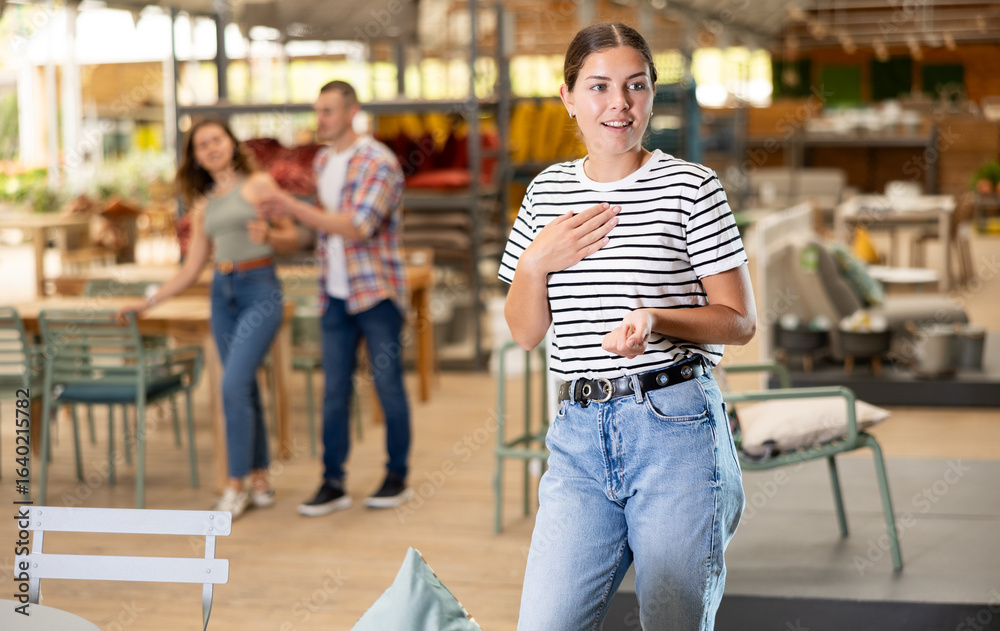 Positive interested young girl engaging in shopping, walking down aisle of home and garden store, exploring with interest furniture and garden supplies around