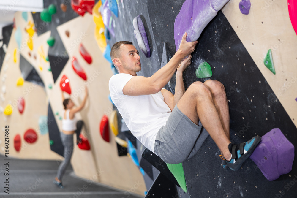 European man is mastering climbing on training wall in gym, side view. He holds on tightly to ledges and strives for top of bouldering route