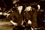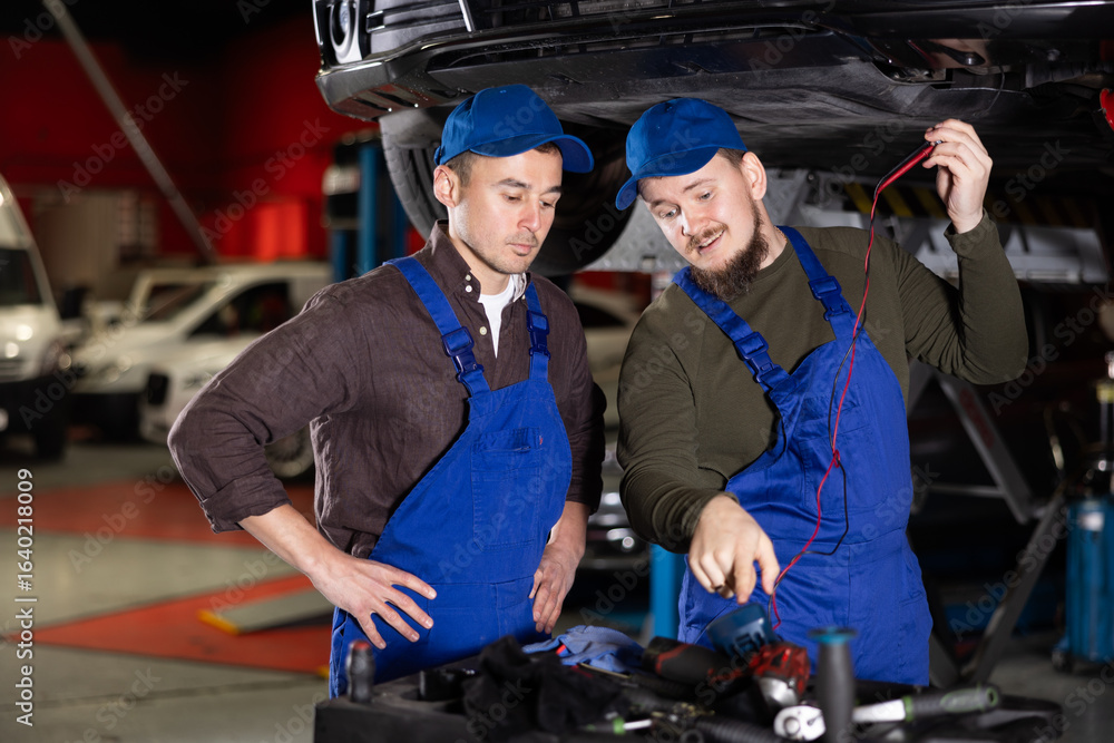 Two auto mechanics work together to diagnose an engine using a measuring device in a car service center