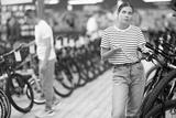 Interested young girl chooses for himself sports bike in big bicycle shop from range